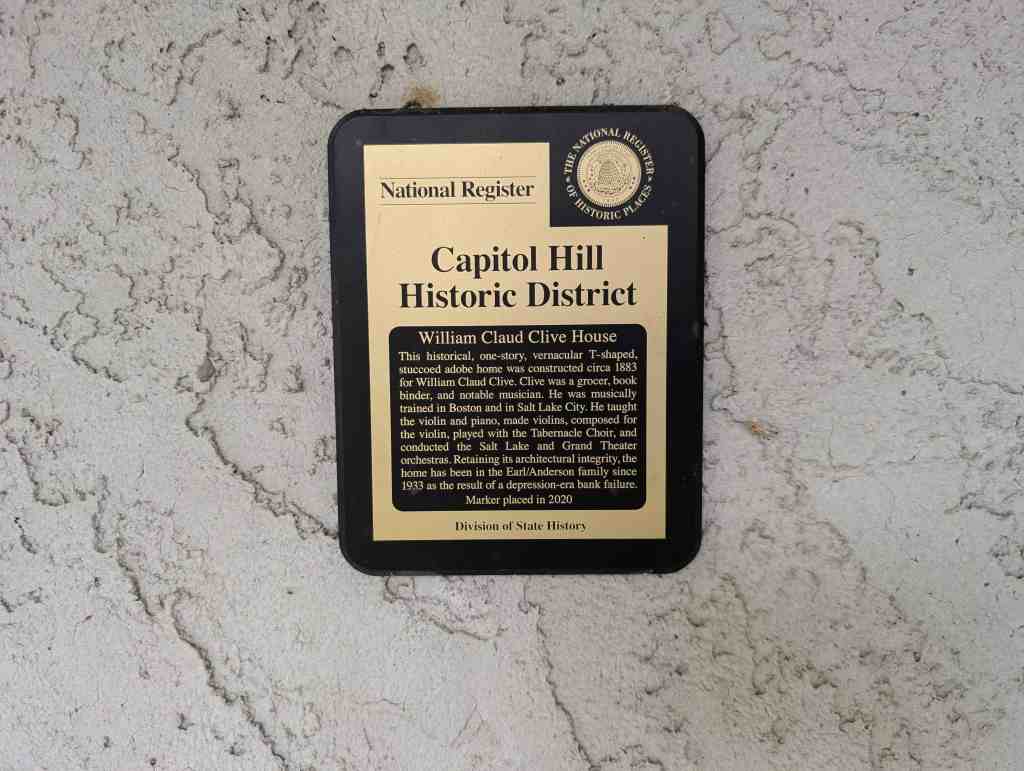 This historical, one-story, vernacular T-shaped, stuccoed adobe home was constructed circa 1883 for William Claud Clive. Clive was a grocer, book binder, and notable musician. He was musically trained in Boston and in Salt Lake City. He taught the violin and piano, made violins, composed for the violin, played with the Tabernacle Choir, and conducted the Salt Lake and Grand Theater orchestras. Retaining its architectural integrity, the home has been in the Earl/Anderson family since 1933 as the result of a depression-era bank failure.