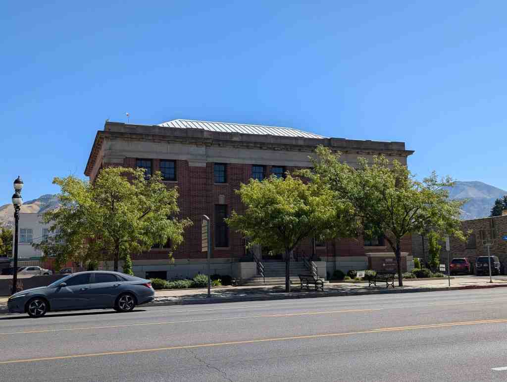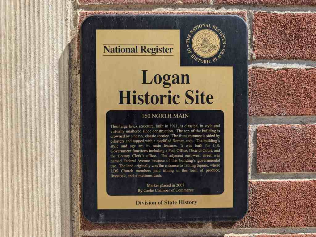 This large brick structure, built in 1911, is classical in style and virtually unaltered since construction. The top of the building is crowned by a heavy, classic cornice. The front entrance is sided by pilasters and topped with a modified Roman arch. The building’s style and age are its main features. It was built for U.S. Government functions including a Post Office, District Court, and the County Clerk’s office. The adjacent east-west street was named Federal Avenue because of this building’s governmental use. The land originally was the entrance to Tithing Square, where LDS Church members paid tithing in the form of produce, livestock, and sometimes cash.