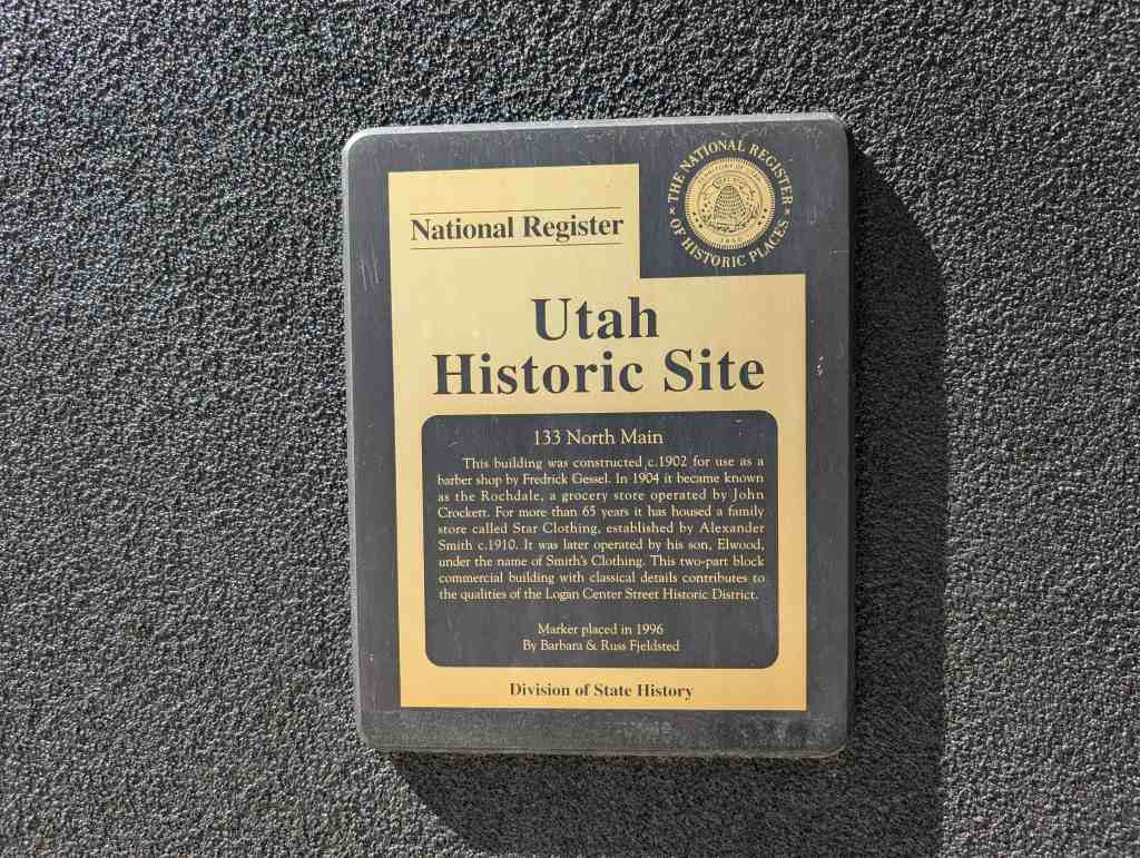 This building was constructed c.1902 for use as a barber shop by Fredrick Gessel. In 1904 it became known as the Rochdale, a grocery store operated by John Crockett. For more than 65 years it has housed a family store called Star Clothing, established by Alexander Smith c.1910. It was later operated by his son, Elwood, under the name of Smith’s Clothing. This two-part block commercial building with classical details contributes to the qualities of the Logan Center Street Historic District.