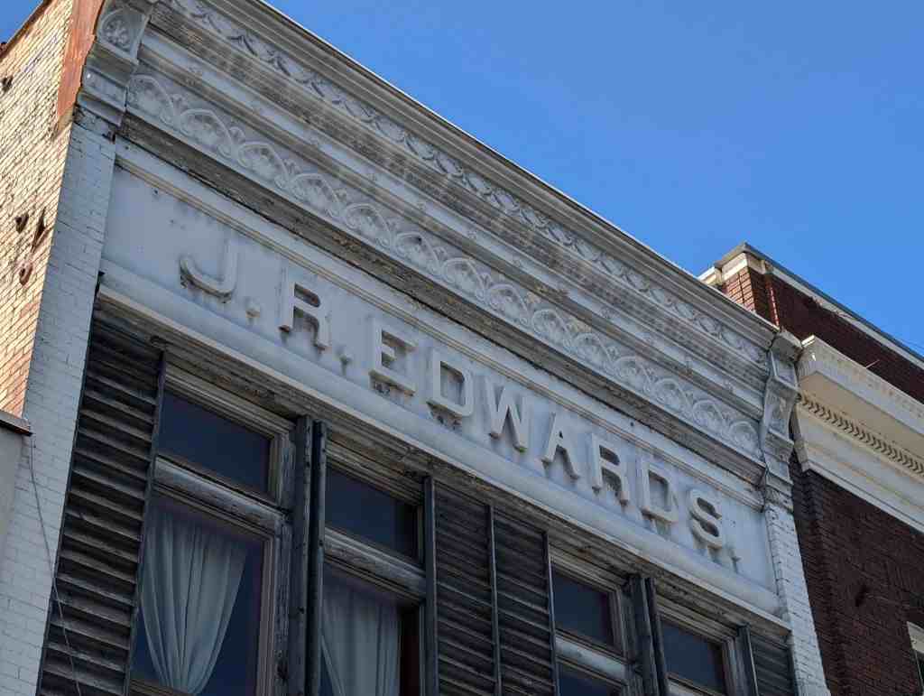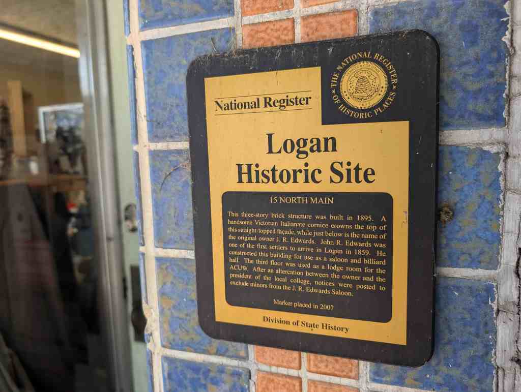 This three-story brick structure was built in 1895. A handsome Victorian Italianate cornice crowns the top of this straight-topped façade, while just below is the name of the original owner J. R. Edwards. John R. Edwards was one of the first settlers to arrive in Logan in 1859. He constructed this building for use as a saloon and billiard hall. The third floor was used as a lodge room for the ACUW. After an altercation between the owner and the president of the local college, notices were posted to exclude minors from the J. R. Edwards Saloon.