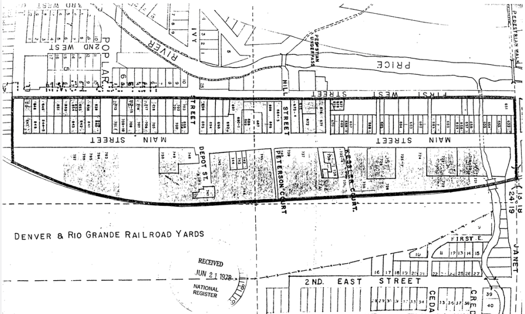 Comparison of the present appearance of the district with early Sanborn maps and historic photos indicates that the area still retains much of its historic character. Prior to 1927 the area east of Main Street was dominated by Denver and Rio Grande Western (D&RGW) railroad company houses, but after that time, the area began to acquire the predominately commercial appearance it retains today. The modifications of the residential buildings have been fairly minor and have generally consisted of “modern” siding materials and additions, and modification of the porches. The commercial seen facade modifications, many of which are the installation of the enclosure or buildings have often minor and reversable.