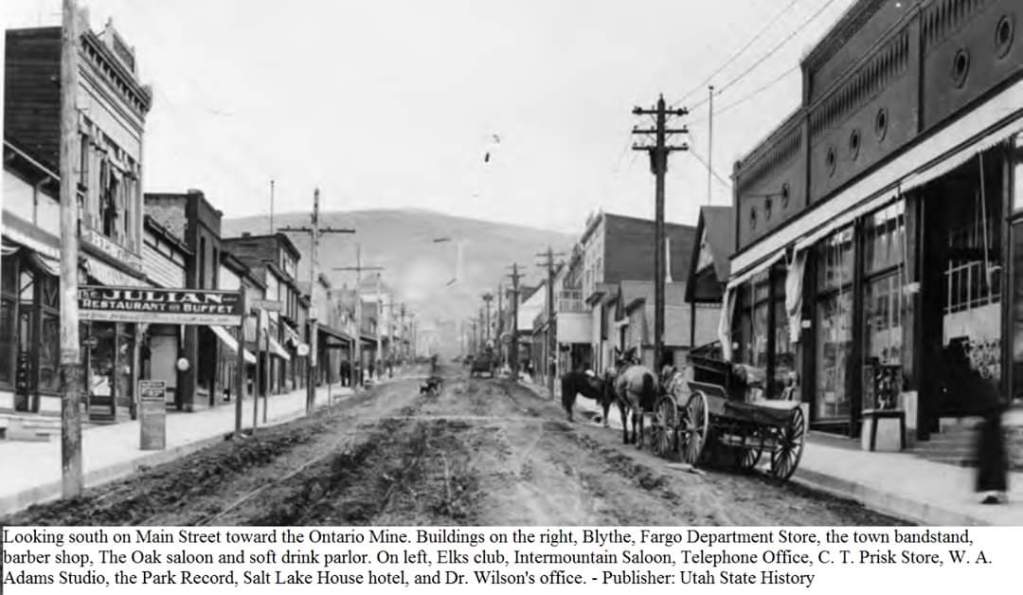 The Park City commercial district contained numerous businesses, as well as various social halls and meeting places, public buildings and at the base the Union Pacific Railroad Depot (built in 1885, withstanding the 1898 fire, and remining). A scrutiny of Utah business directories reveals that in 1892-1893, 112 businesses (including physicians and lawyers, but not mining companies) existed; while in 1903-1904, approximately 136 concerns operated in Park City. By 1918-1919, the number had declined to 87, and in 1920-1921, 75. All facets of daily living were embodied in the district, and while the situation has changed, Park City’s present recreational emphasis still finds Main Street as a vital link in every day life.