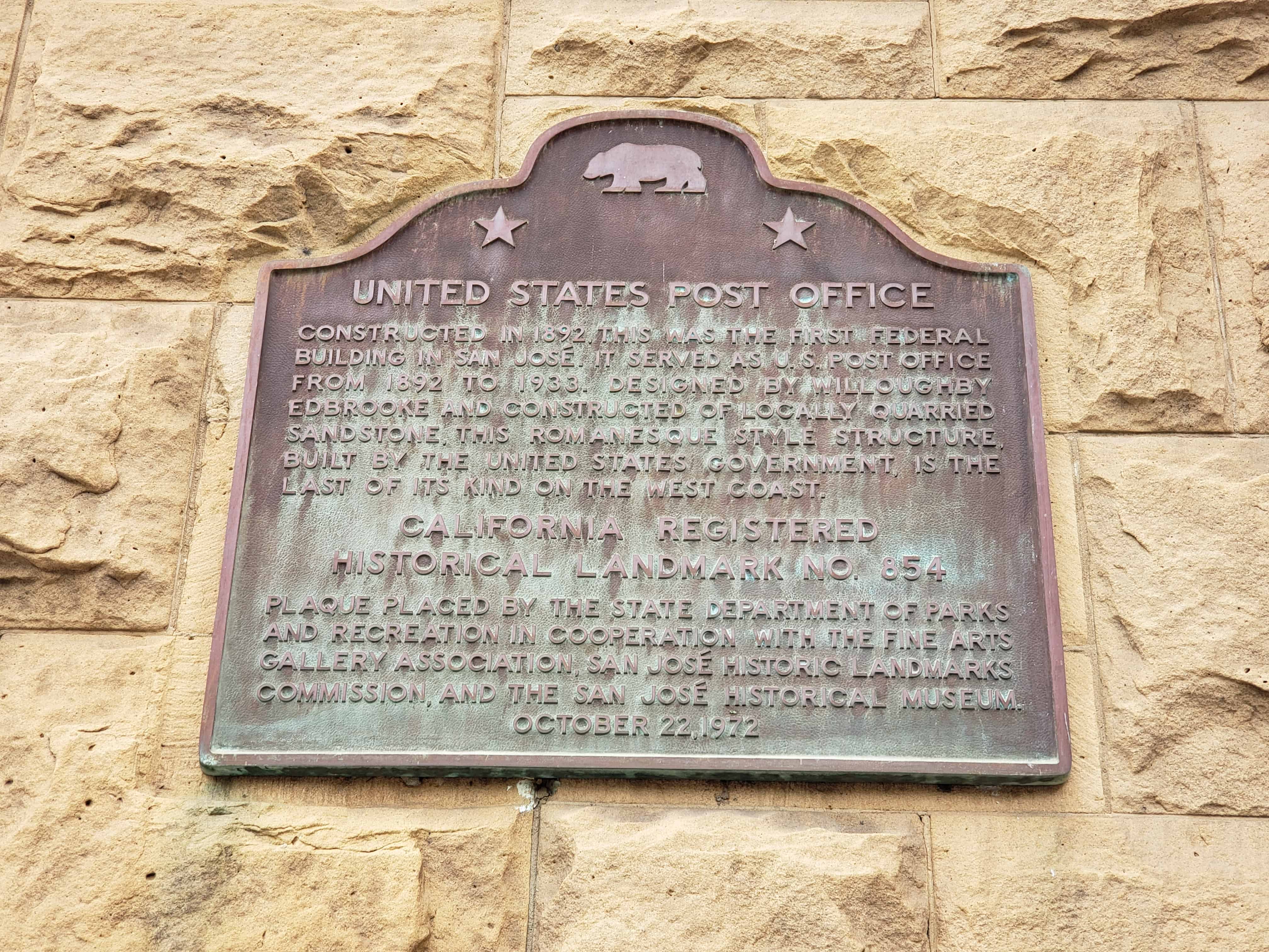 Constructed in 1892, this was the first federal building in San Jose. It served as U.S. Post Office from 1892 to 1933. Designed by Willoughby Edbrooke and constructed of locally quarried sandstone, this Romanesque style structure, built by the United States government, it the last of its kind on the west coast.