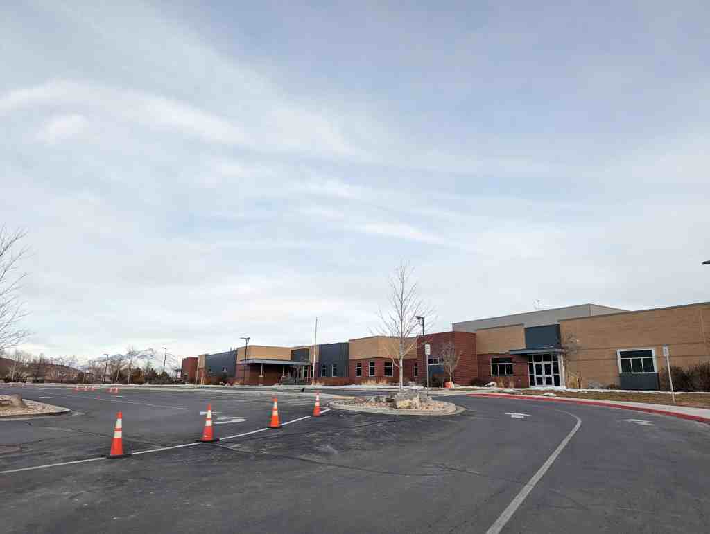 The school is located toward the front of an open corner lot with a lawn/dirt surrounding it on the south, west and east sides A short concrete retaining wall faces the west side of the lot along the front sidewalk. Plants include three large juniper trees growing next to the building on the right half of the west façade, a large spruce tree at the northwest corner a small deciduous tree on the south end and two other deciduous trees—one at the northeast and one at the southeast corner. There is also a large concrete flag pole base with the 2002 Winter Olympics logo embossed in it. Behind (to the east of) the school is a large blacktopped parking area and a larger concrete pad that was used as a basketball court. To the east of this is a small lawn-covered field ascends up a slight rise to the street behind the school. The north, east and most of the south borders or the property are enclosed by chain-link fencing. Other than a small temporary metal shed, there are no permanent outbuildings on the property.