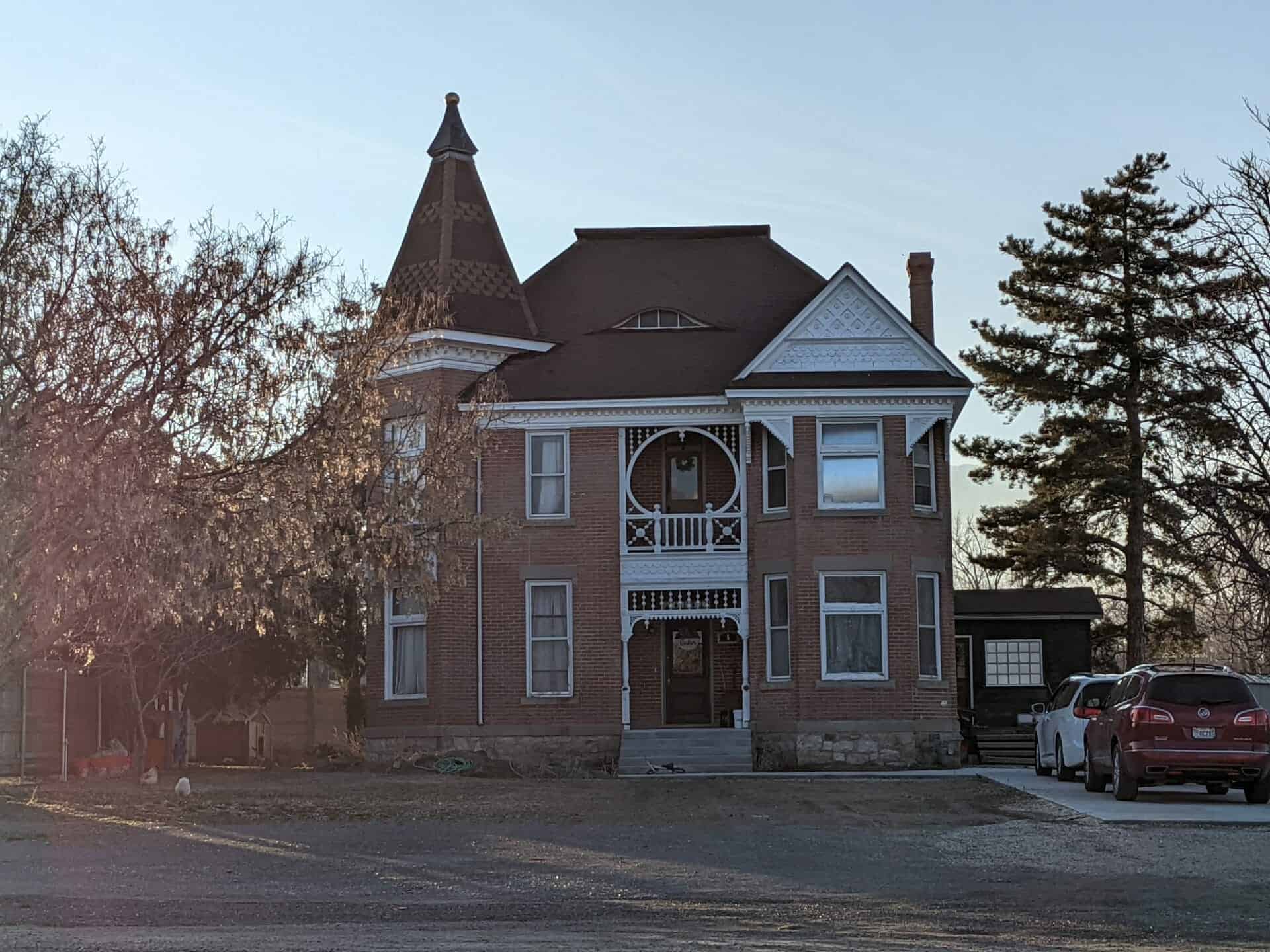 This Victorian Eclectic and Queen Anne style house remains as one of the most distinctive architectural landmarks of Manti. The house, which initially consisted of only two rooms, was begun in 1896 by Lewis R. (L.R.) Anderson. After he returned from a two-year LDS mission, he began construction on the staircase and upper bedrooms, adding the back bathroom, kitchen, and basement by 1899. The last addition was made in 1915 when he built a large bay window in the dining room to display Clara’s plants. The chicken coop and brick carriage house were built in the 1920s.