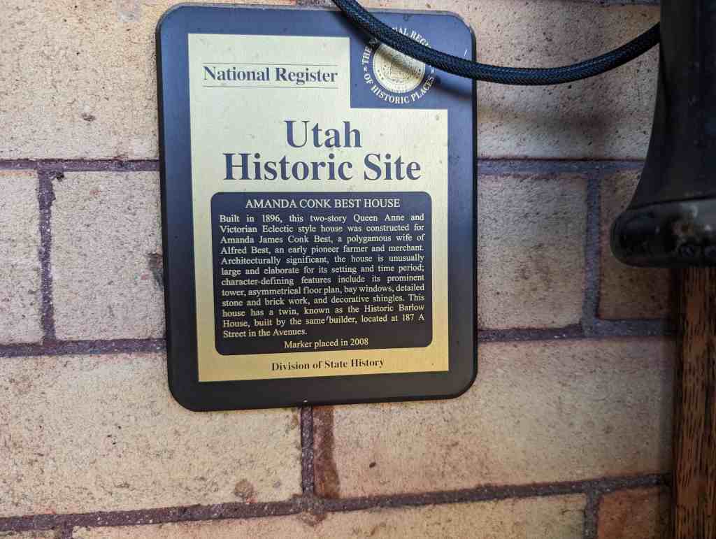 Built in 1896, this two-story Queen Anne and Victorian Eclectic style house was constructed for Amanda James Conk Best, a polygamous wife of Alfred Best, an early pioneer farmer and merchant. Architecturally significant, the house is unusually large and elaborate for its setting and time period; character-defining features include its prominent tower, asymmetrical floor plan, bay windows, detailed stone and brick work, and decorative shingles. This house has a twin, known as the Historic Barlow House, built by the same builder, located at 187 A Street in the Avenues.