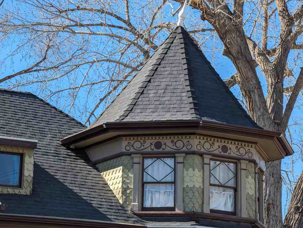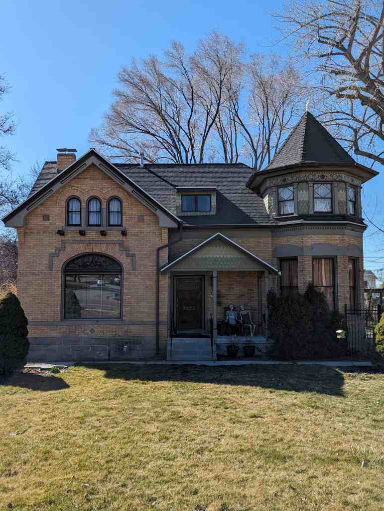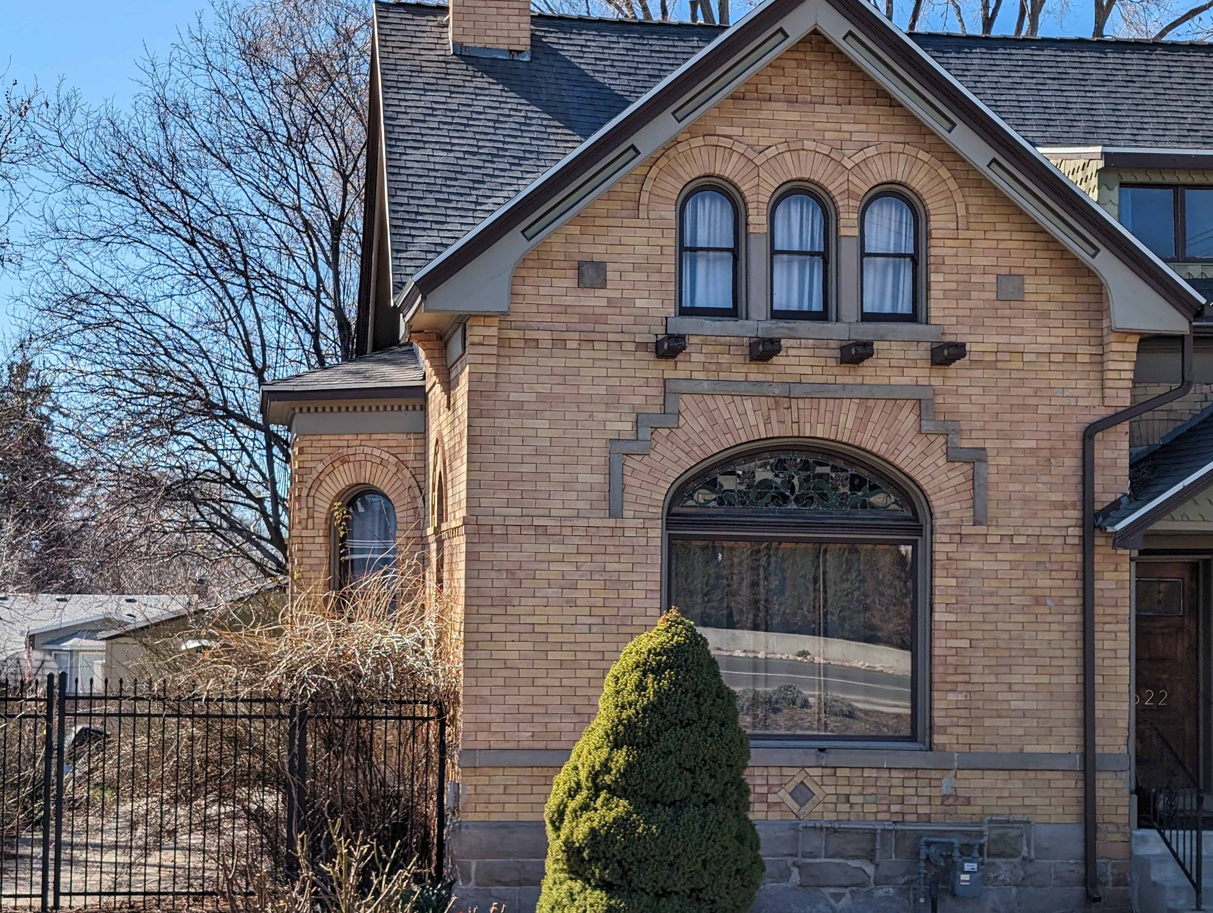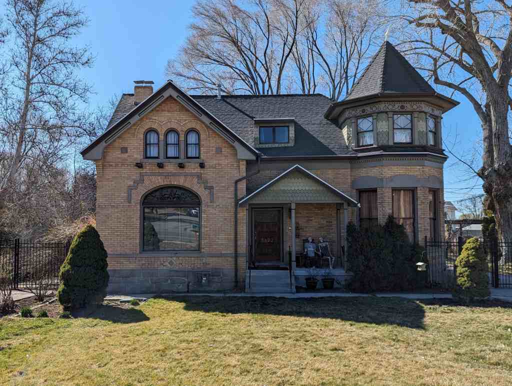 This house is a fine example of Utah’s expression of the Queen Anne style. Typical of the Queen Anne style is the asymmetrical composition, and the variety of materials, texture, and color. Brick was used instead of wood, the common building material for examples of the style in other parts of the country, because it was probably the most readily available material. The brick, however, contrasts with the stone of the foundation and the wood of the gable sections and porches. An active visual image was created by topping the irregular form with a hip roof from which several gable sections project in various directions. The decorative brickwork over the windows and along the major chimney flue, in combination with the patterned shingles and bargeboards of the gable sections and the stained glass panels of the window sashes provide a variety of textures and patterns. Two colors have been combined on the gable sections and contrast with the red bricks. The conical roof on the porch, the multi-planed roof, the fish-scale shingles on the gable sections, the stained glass lights around the upper sashes of the windows, the bargeboards, and the wrap around porch are elements that are typical of the Queen Anne style.