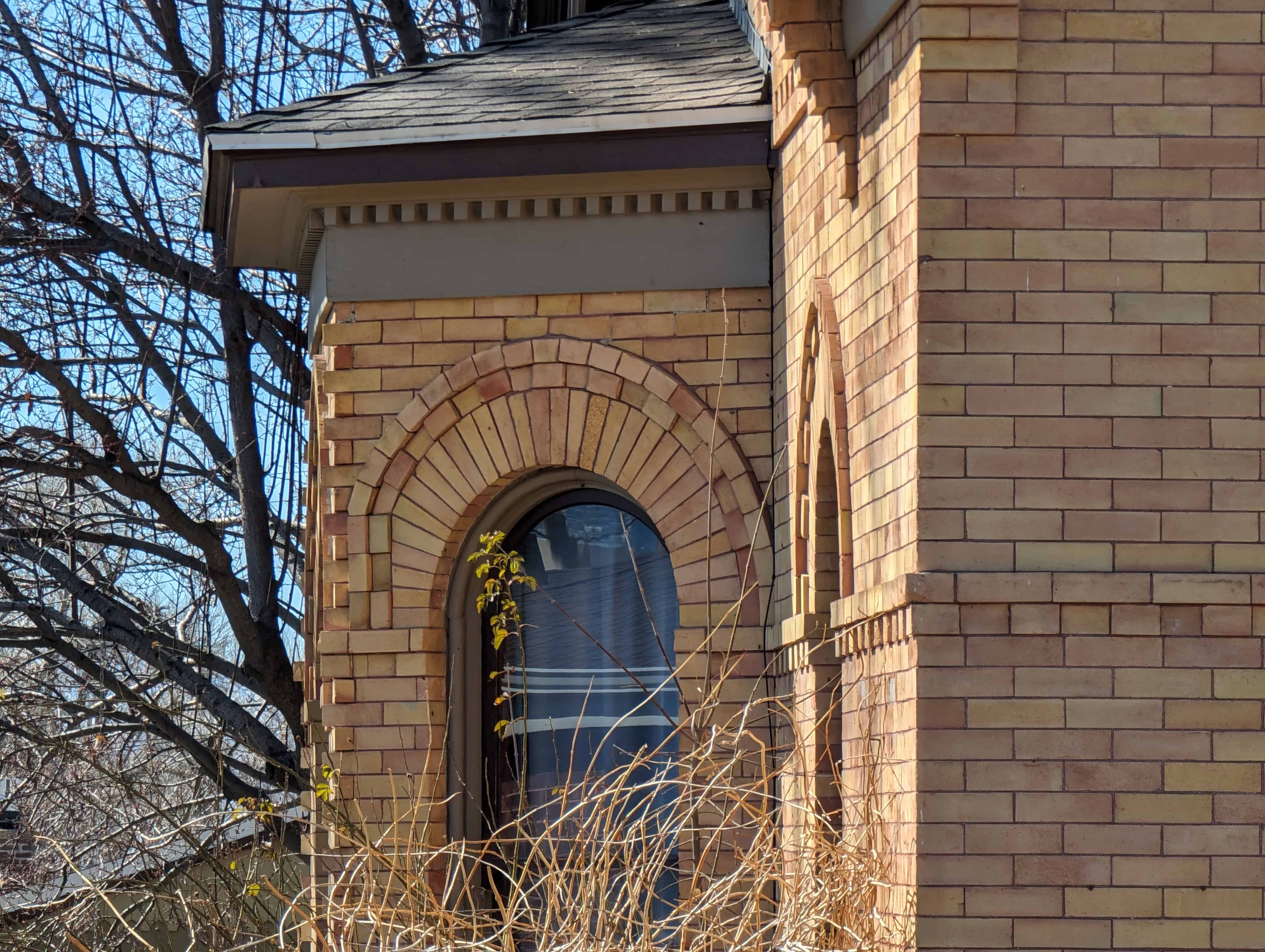 All the windows on the first story of the north façade have been changed from tall narrow openings with soldier brick retrieving arches to square or horizontal windows with aluminum sashes. The upper story of the gable at the center of this façade has an exotic arched window matching the others. A tall corbelled chimney on the north roof pitch is in good condition.