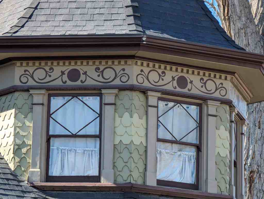 Double hung sash windows pierce each of the panels of the three part bays. There is a single double hung sash window per story on all panels of each window bay. The relieving arches of the first story windows are accented by decorative brickwork, compared with the simple arches of the second story windows. A band of stained glass lights frame the upper sash of each window the three part bays. The pediments of the gable section over each three part window bay are highlighted by fish-scale patterned shingles, a bargeboard into which a decorative pattern has been incised, and a small rectangular window with a simple pediment over it. Large decorative brackets intersect below the corners of each pediment. Decorative posts support the second story screen porch, and a unique spindle band spans the spaces between posts. A sunburst decorative element fills the pediment of the porch gable.